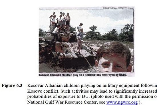 Слика 11. је преузета из документа Светске здравствене организације [8]. Треба нагласити да је вероватно тај тенк био уништен пројектилима који су садржали осиромашени уранијум, тако да је прашина са честицама осиромашеног уранијума сигурна била присутна на тенку и око тенка. Очигледно је да нико није упозорио ову децу да не прилазе тенку.