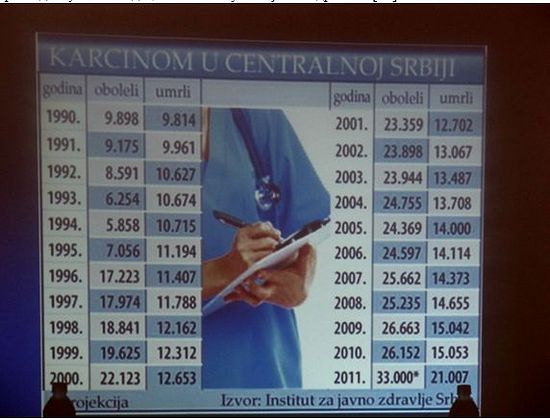 Пораст канцерогених обољења у Србији после 1999. године је алармантан, али до јавности стиже врло мало релеватних података и анализа. Др Зорка Вукмировић је 2013. године на промоцији књиге Екологија и рат, коју је приредио проф. др Вукашин Павловић [12], приказала табелу (Слика 12) у којој је сумаризован број ново–откривених канцерогених обољења у Србији од 1990. до 2011., као и број умрлих од канцерогених обољења у истом периоду. Ова табела је припремљена према доступним подацима Института за јавно здравље [12].
