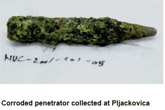 (2) Да већина пенетратора није уклоњена и да је остала под земљом. Пенетратори који су пронађени близу површине у току 7 година од бомбардовања (у БиХ) су због корозије већ били изгубили око 25% масе. У касарни у Хан Пијеску после 7 година од бомбардовања пронађени су пенетратори који су лежали на површини кородирани. Загађење је било велико и у Хаџићима.