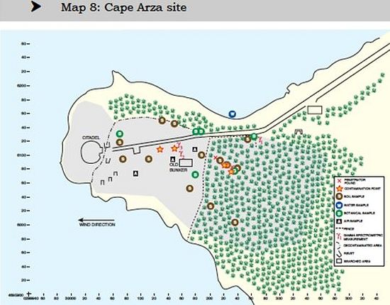 Слика 7. Путачом су означена места на којима су пронађени пенератори а звездицама места на којима је пронађено загађење осиромашеним уранијумом (Рт Арза, Црна Гора, 2001) [5]