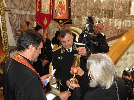 «Почасну мисију доношења Благодатног огња извршио је помоћник команданта Црноморске флоте за рад с верујућим војницима протојереј Александар Бондаренко,» - саопштио је «Интерфаксу» у недељу начелник одељења информативне подршке Црноморске флоте капетан 1. ранга Вјачеслав Трухачов.