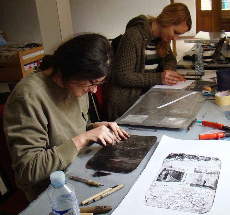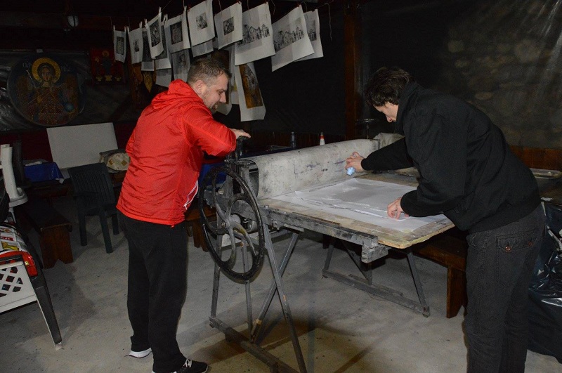-Први пут сам овде у манастиру и први пут у колонији у оваквим условима. Управо радим графику и спремам ове плоче за штампу. На плочама можете видети фрагменте некадашње цркве Св. Архангела. То су рељефасте структуре у камену, орнаменти који су сачувани. Са њима сам комбиновала мотив из цркве Св Ђорђа у Призрену, са једне фотографије на којој је приказан отворени гроб, оскрнављен. Тражила сам инспирацију у свему што сам могла да доживим лично, кроз те рушевине, паљевине, те остатке...
