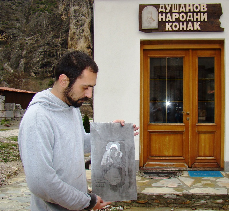 -Мотиви на графикама које радимо су наша реакција на све што се дешавало, а ми то представљамо на алуминијумским плочама и то техником суве игле која до нас допире из средњег века. И то је нека наша веза са највећим бројем наших светиња које су настале баш у том периоду. Ја сам искористио мотив страдалне фреске Богородице са Христом из Богородице Љевишке.