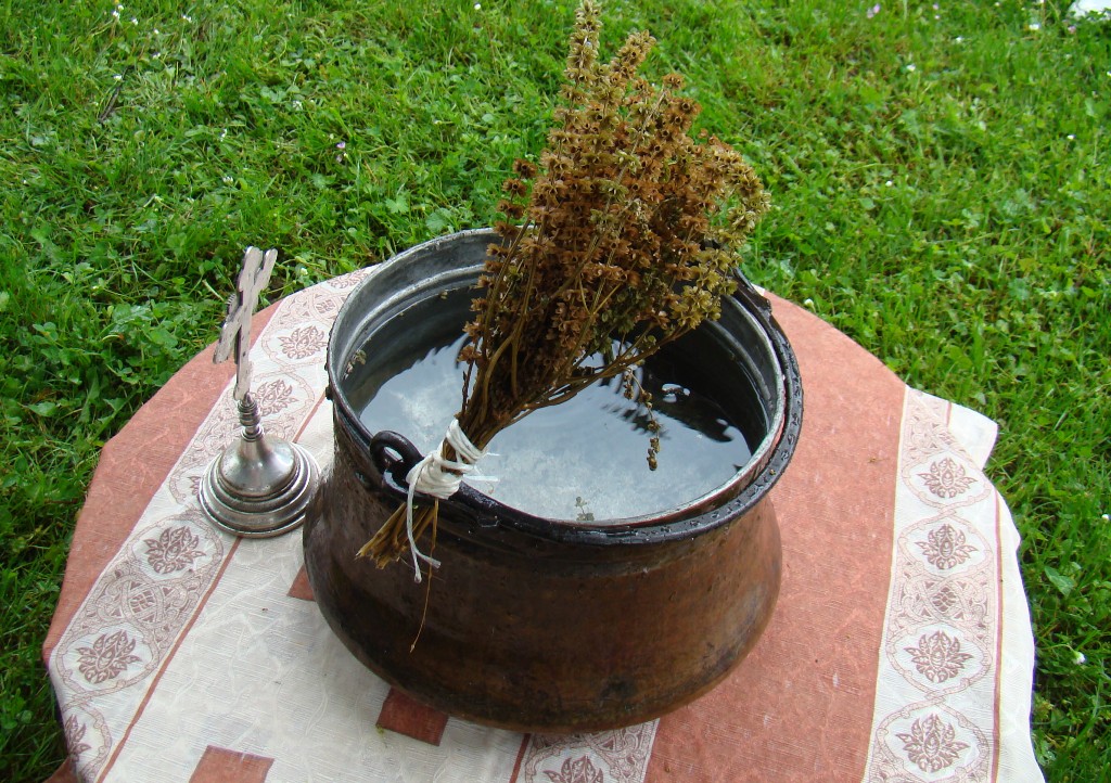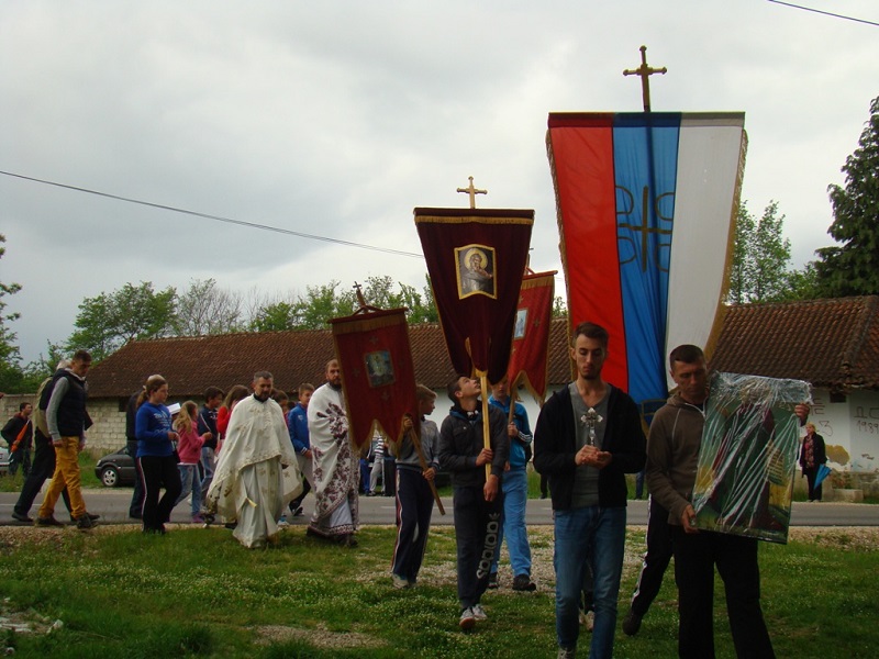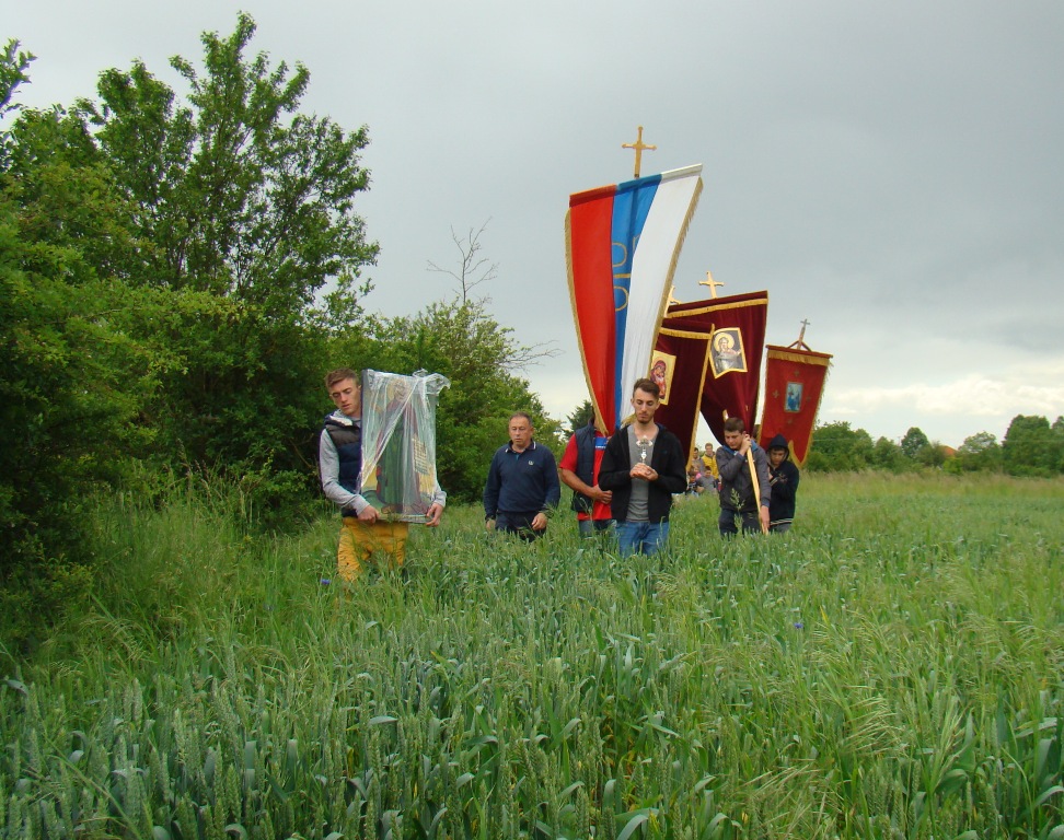 Један домаћинов син Душан иде са иконом, а други Стефан, носи крст и заједно са свештеницима освештава храну и пиће изнету на сто пред кућом. Киша је сипала и даље, али није променила обичаје. Свештеник, иако нов у селу, научио обичај од мештана, и осим што застаје крај домаћина, говорећи ,,срећна Крста“, узима чашу и наздравља, поједе по нешто од понуђене хране, а за њим тако чине и остали из литије. А ,,Крста“ дочекују сви из куће пред којом литија пролази, од најмлађих до најстаријих. Малог Вука Анђелковића, који још увек нема ни годину дана, мајка држи у наручју, а он се смешка као да разуме, шта се дешава. Мало даље пред другом отвореном капијом деда Спасоје Дакић, погурен за асталом са својом супругом, која се на штаку сво време наслања, свраћају литију на послужење,, Приђите, ваља се, узмите нешто, служите се!“. Испред једне куће петнаестак људи. То су Угреновићи. Један од тројице браће, Ђорђе, је био рањен на Бистрици те 2003. године, али га рањавање и сва искушења која су уследила нису натерала да оде из села. Оженио се девојком из Ораховца Наташом, којој су шиптарски терористи `98. убили брата, а `99. киднаповали оца. Обоје доживели муку, као деца, ал их је Бог спојио и за пет година брака већ имају троје деце: Милицу, Димитрија и Павла. Баш на Јеремијин дан је пет година брака, али и крштење њихове дечице. Ето радости, па је кућа пуна. Дошла браћа, сестре, рођаци. Трче деца по дворишту, не смета им ни киша која не престаје.