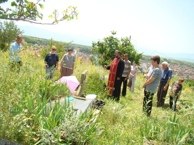 Ковиљка Бањац је из Краљева, где живи после прогона из Метохије, по први пут, после 1999. године, дошла да обиђе гробове својих упокојених. Споменик на гробу њене мајке Ковиљке Радић, чије име носи, је срушен, а отац је сахрањен у црквеној порти. На њен позив свештеник је сишао и до новог дела гробља, на којем су се Срби сахрањивали 1997. године, и одслужио помен.