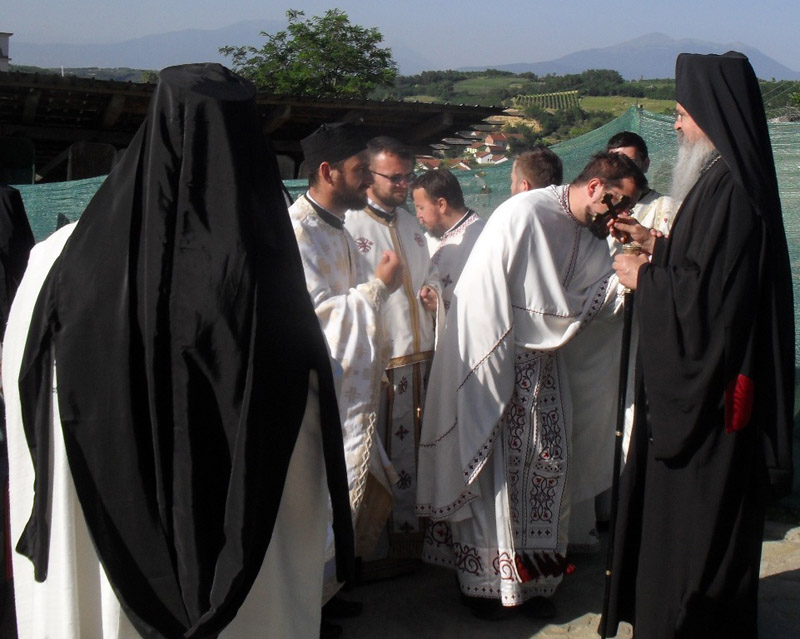 Са јутарњим зрацима сунца и звонима са звоника још народа пристиже. Већ их је на стотине стигло, да дочека владику Теодосија са монаштвом из Дечана, Грачанице, Патријаршије Пећке, Бањске, Светих Архангела, Драганца, Ђаковичког Успења... А Литургија под ведрим небом у порти са којег је сунце упекло. Владика Теодосије началствује, саслужује му још шеснаест свештенослужитеља, игумана, свештеника, свештеномонаха.